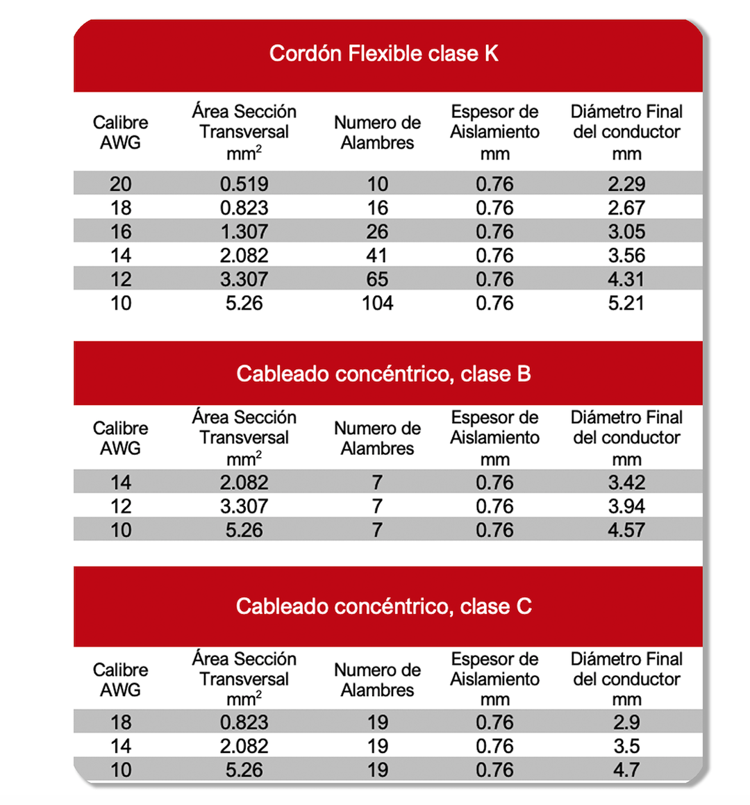 Conductor de cobre suave cableado concéntrico B, C o cordón flexible K, de cobre electrolítico, 99.9% de pureza, con grandes propiedades mecánicas y eléctricas, con aislamiento termoplástico de Policloruro de Vinilo PVC-LS, con propiedades anti-flama, baja emisión de humos, resistente a la propagación de incendios y baja generación de gas acido(HCL) en combustión. Soporta una tensión máxima de 600 V, soporta desde 75 °C hasta 90 °C en ambiente seco y hasta 105 °C en emergencia.