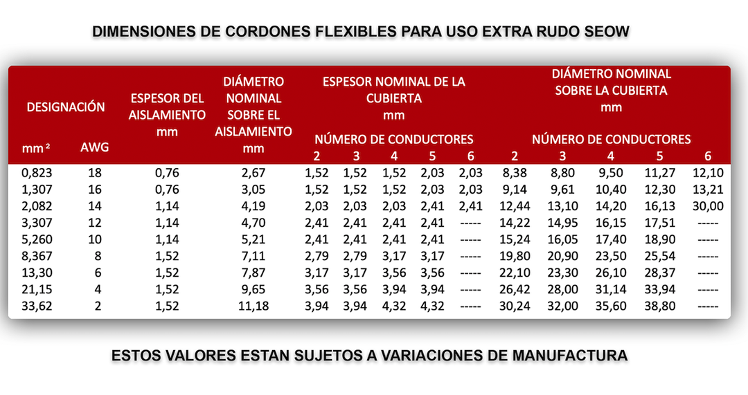 Los cordones flexibles uso extra rudo tipo SEOW, se emplean para el suministro de energía eléctrica de baja tensión por ejemplo: Equipo médico, pulidoras industriales, lijadoras, lavadoras, herramientas y equipo eléctrico portátil o semiportátil, en condiciones severas de operación (Tensión máxima 600 V).